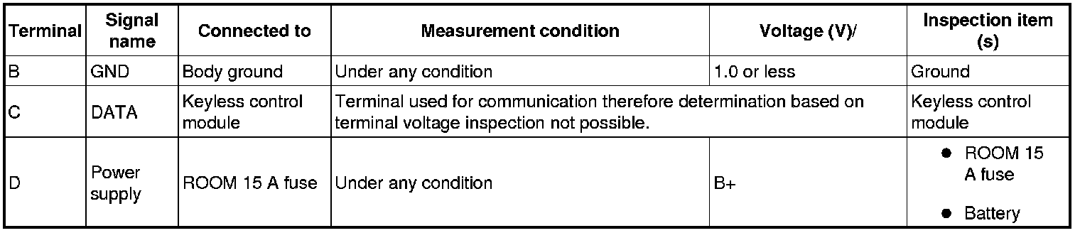 - If the voltages cannot be verified as indicated in the terminal voltage table, inspect the parts under "Inspection item (s)".