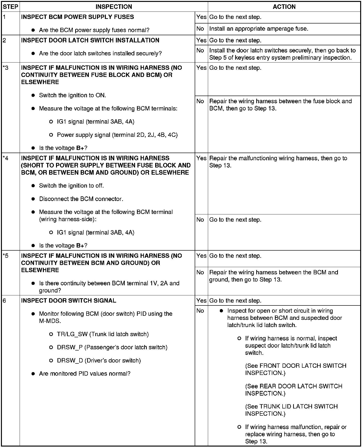- When performing an asterisked (*) troubleshooting inspection, slightly shake the wiring harness and connectors while performing the inspection to discover whether poor contact points are the cause of any intermittent malfunctions. If there is a problem, verify that the connectors, terminals and wiring harnesses are connected correctly and undamaged.