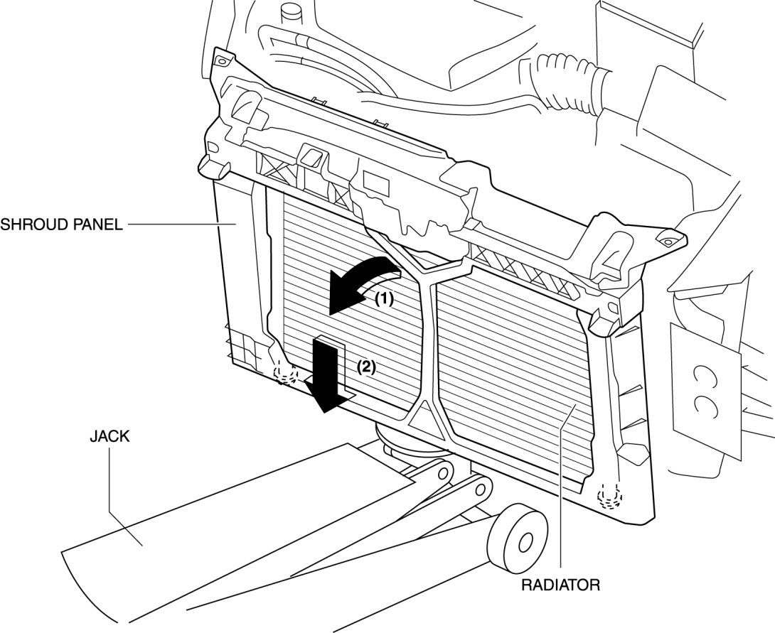 - Support the lower surface of the radiator with a floor jack to prevent the radiator from falling off after the shroud panel is removed.