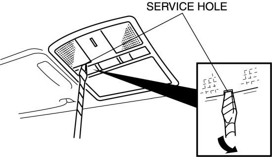 1. Insert a tape-wrapped flathead screwdriver into the service hole and pry with the screwdriver in the direction shown by the arrow to remove the lens.