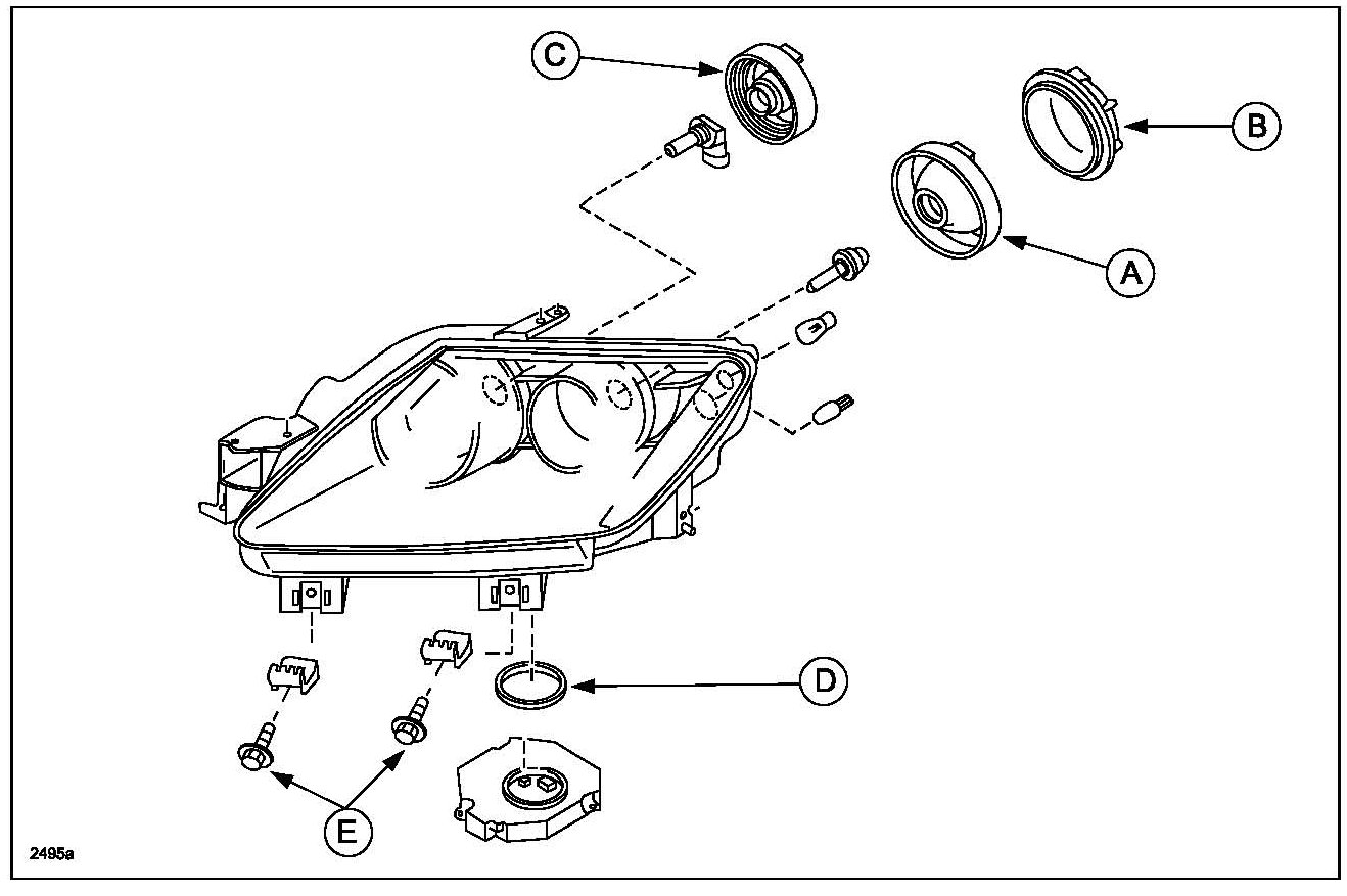 When dealing with customer complaints of excessive condensation and/or water within the headlamp unit, first determine if all the bulb sockets are present and correctly installed. In most cases you will find that the Bulb Seal No. 1(A) or HID Bulb Seal No. 1(B) and Bulb Seal No.2 (C) socket covers have not been correctly installed or are missing due to improper prior repairs (i.e., customer replacing the headlamp bulbs or body shop not transferring them when replacing the headlamp unit(s) due to a collision). Any damage caused by missing socket covers, HID module seal (D), or missing bumper brackets (E) is not covered by warranty policy.