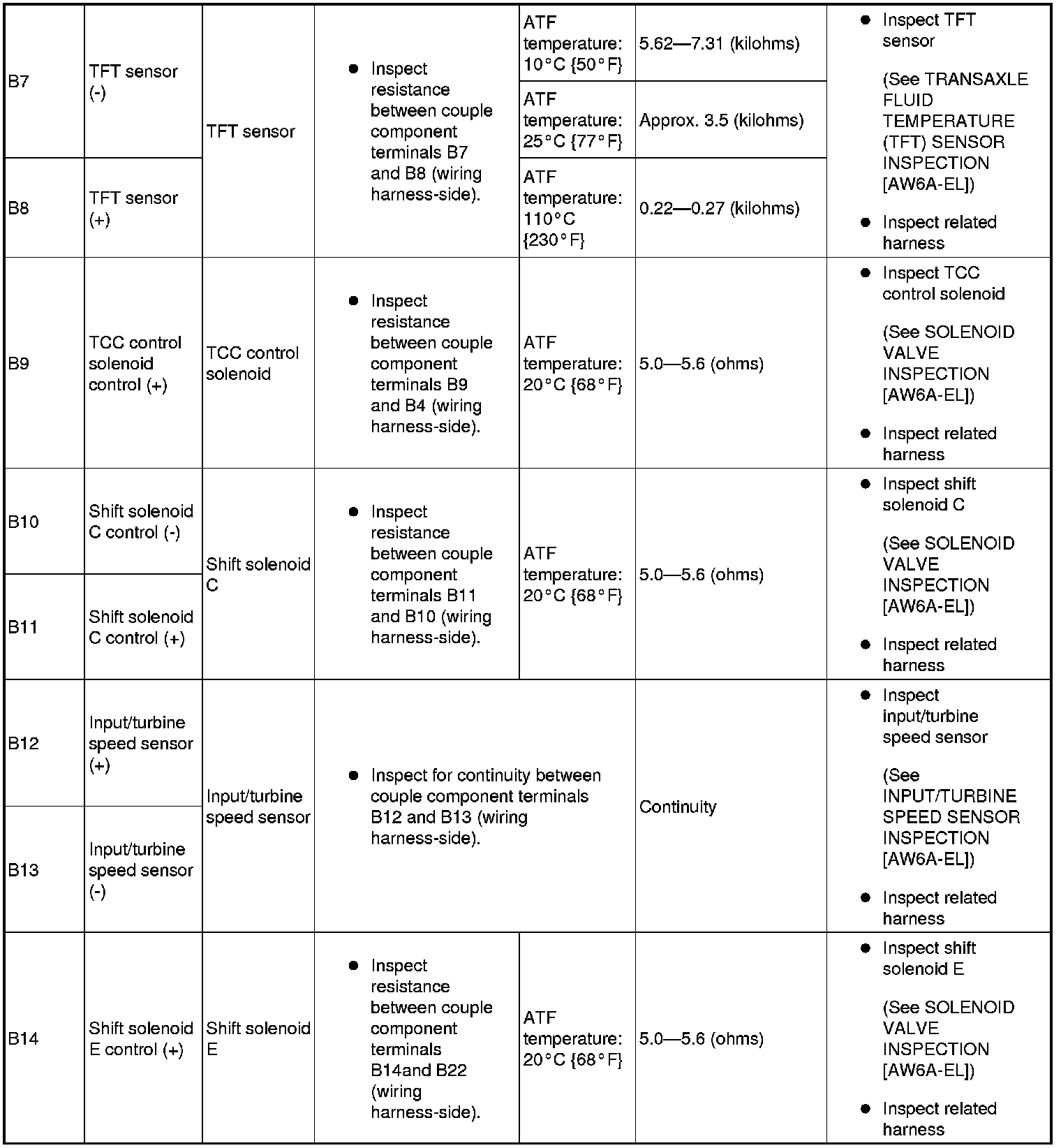 Terminal Continuity/Resistance Table (Reference)