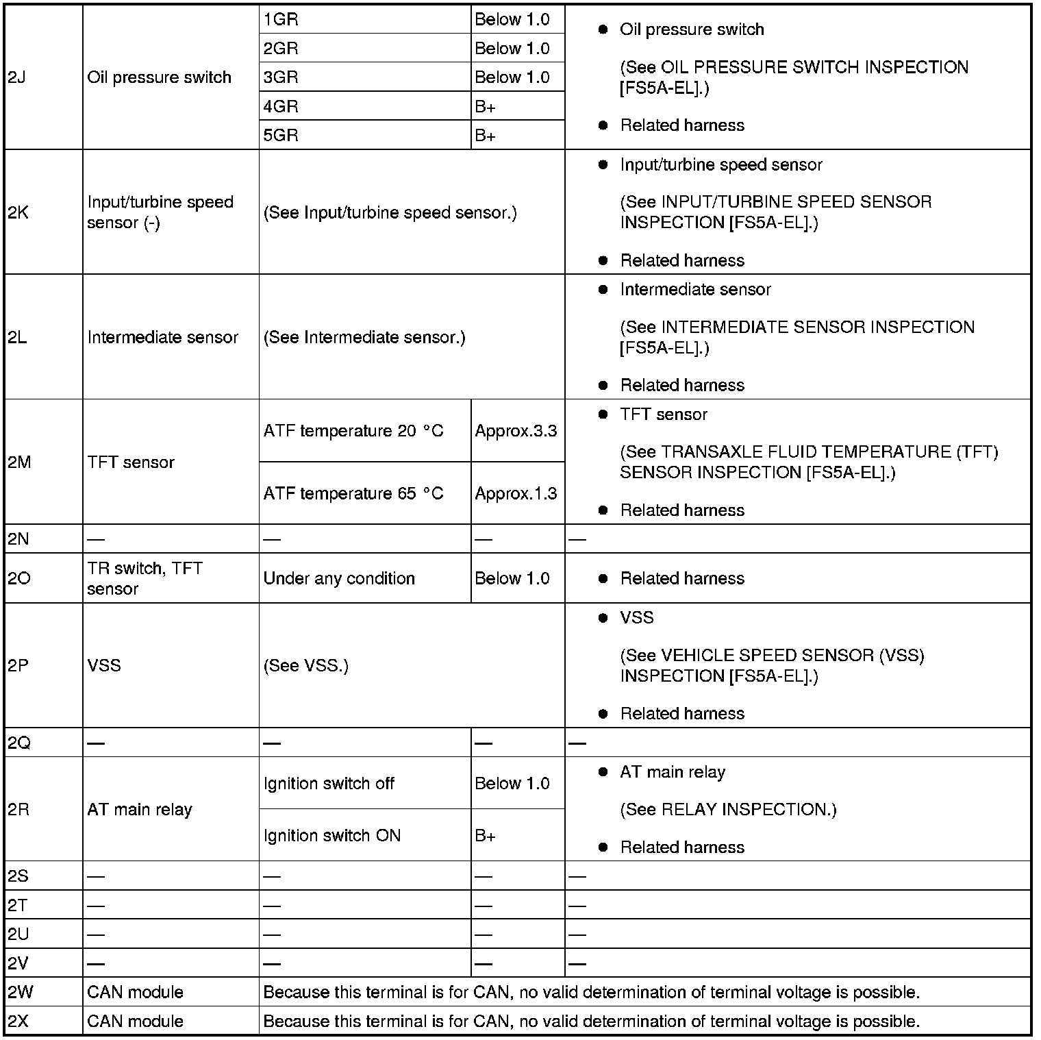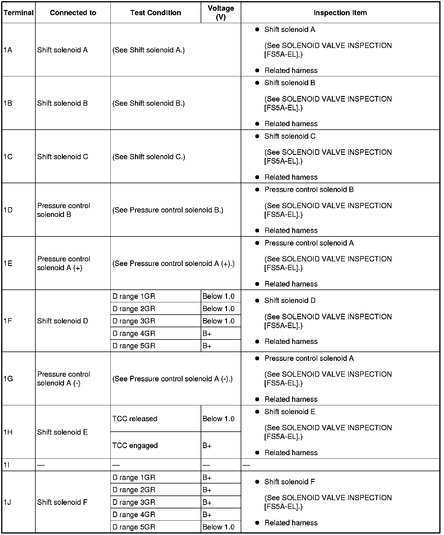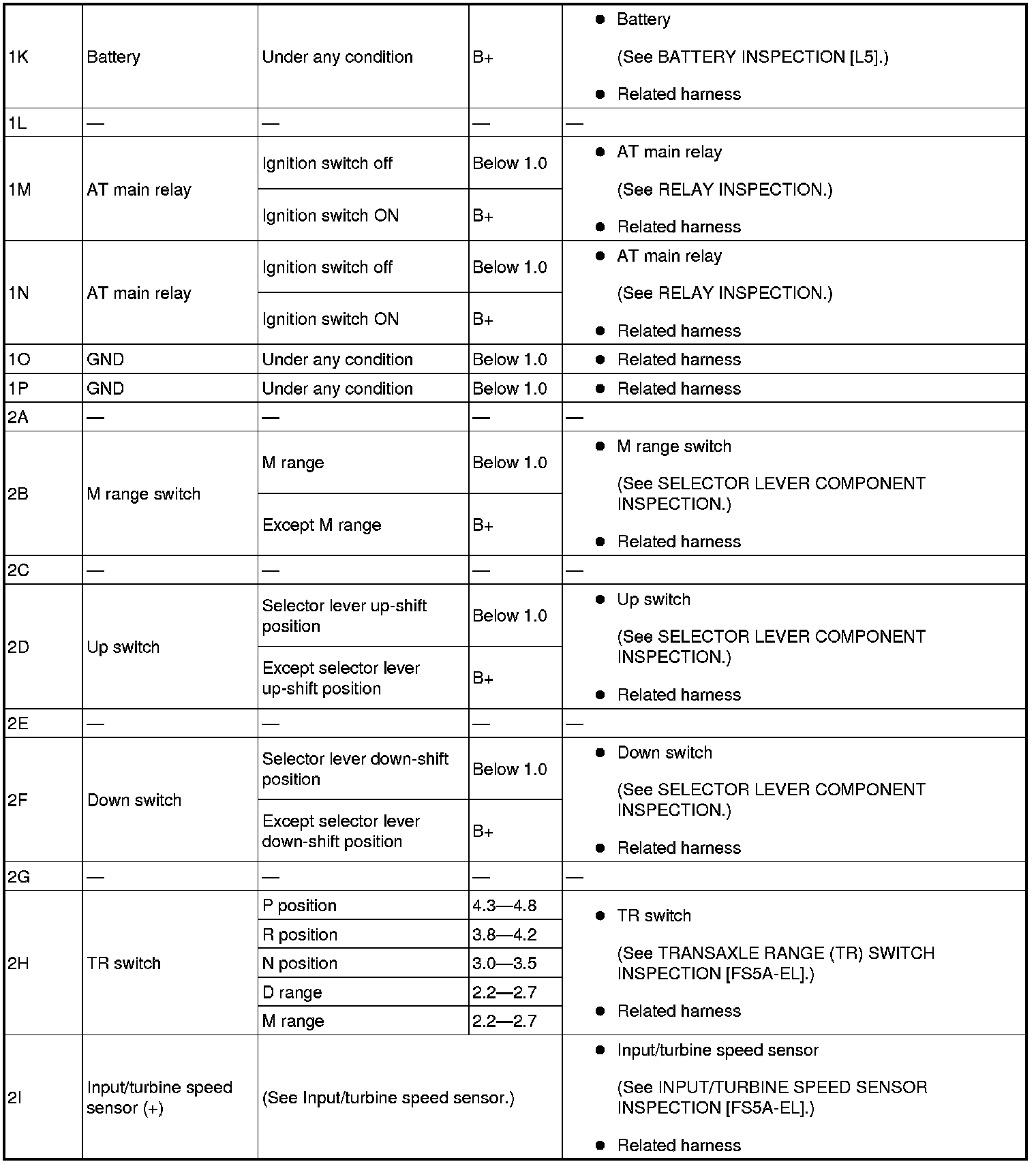 - If any incorrect voltage is detected, inspect the related system(s), wiring harnesses and connector(s) referring to the "Inspection Item" column in the "TCM Terminal Voltage".