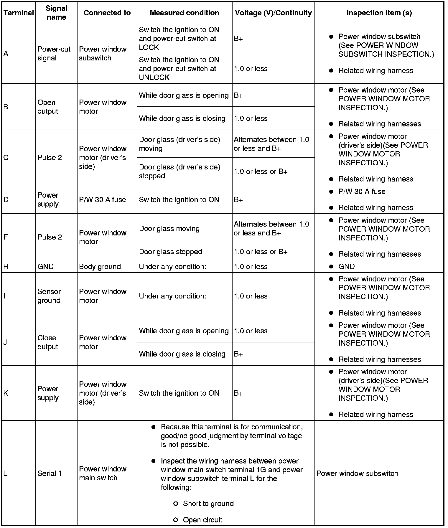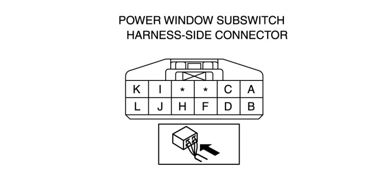 7. Inspect the power window subswitch connector for continuity at terminals H and I.