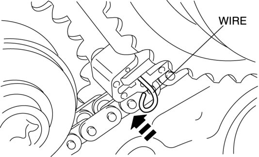 6. Remove the retaining wire inserted into the camshaft timing chain tensioner (LH).