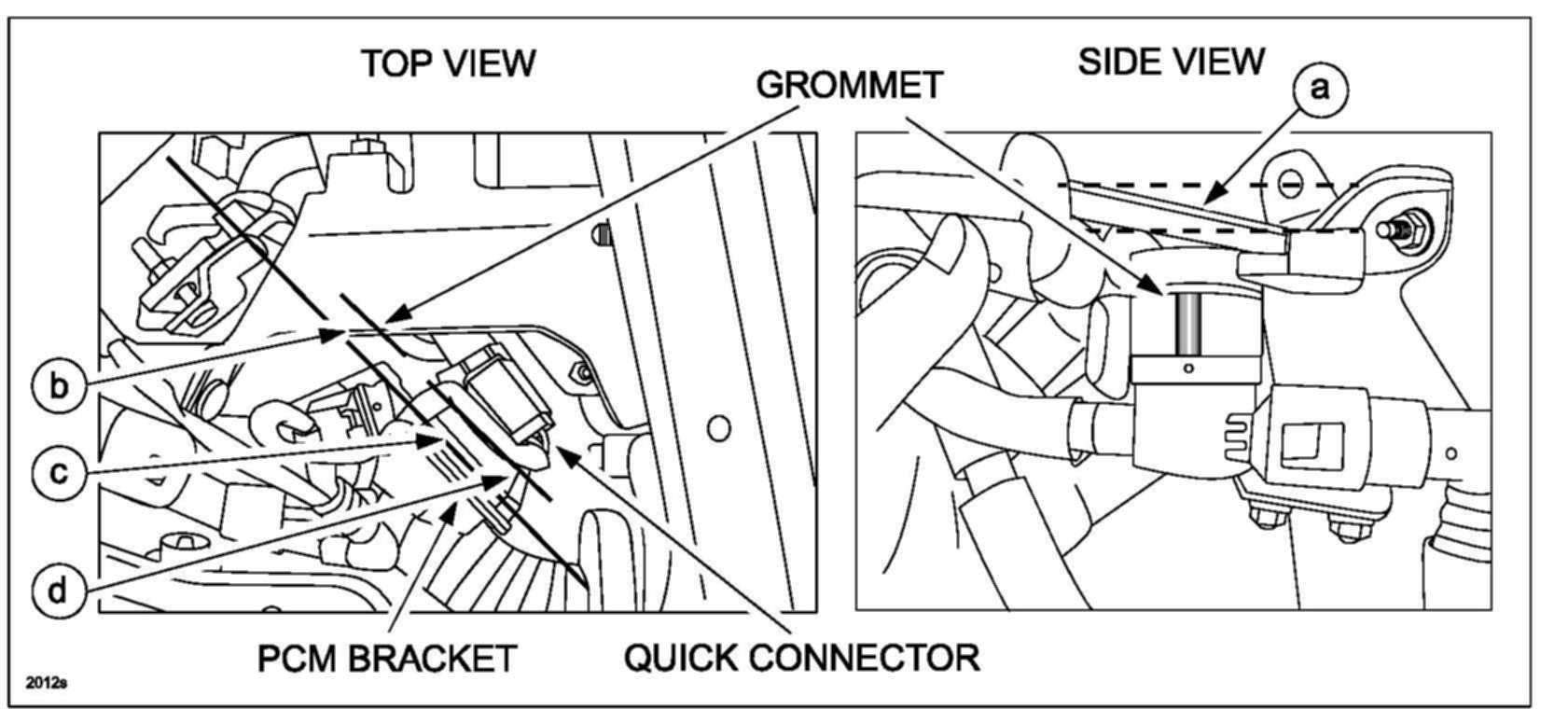 d. Lower hose quick connector and lower PCM bracket.