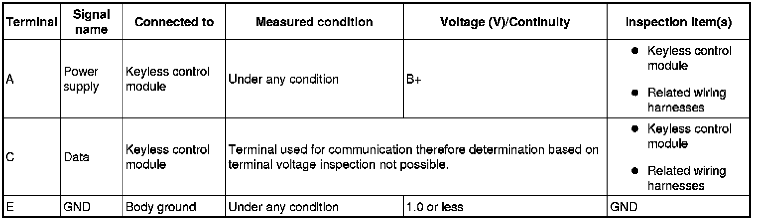 1. Measure the voltage or inspect for continuity according to the Terminal Voltage Table (Reference).