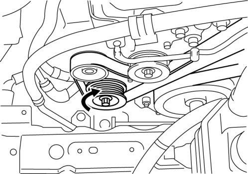 2. Rotate the drive belt auto tensioner in the direction shown in the figure and remove the drive belt.