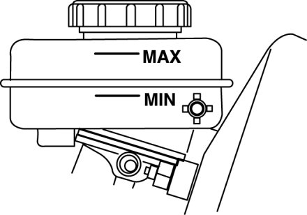 Inspect whether the fluid level in the brake fluid reservoir tank is between MIN and MAX.