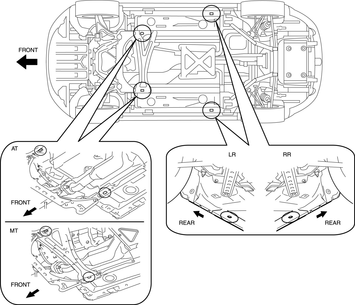 - When transporting the vehicle by flat bed tow truck or trailer, secure the vehicle to the trailer using the holes and tiedown loop shown in the figure.