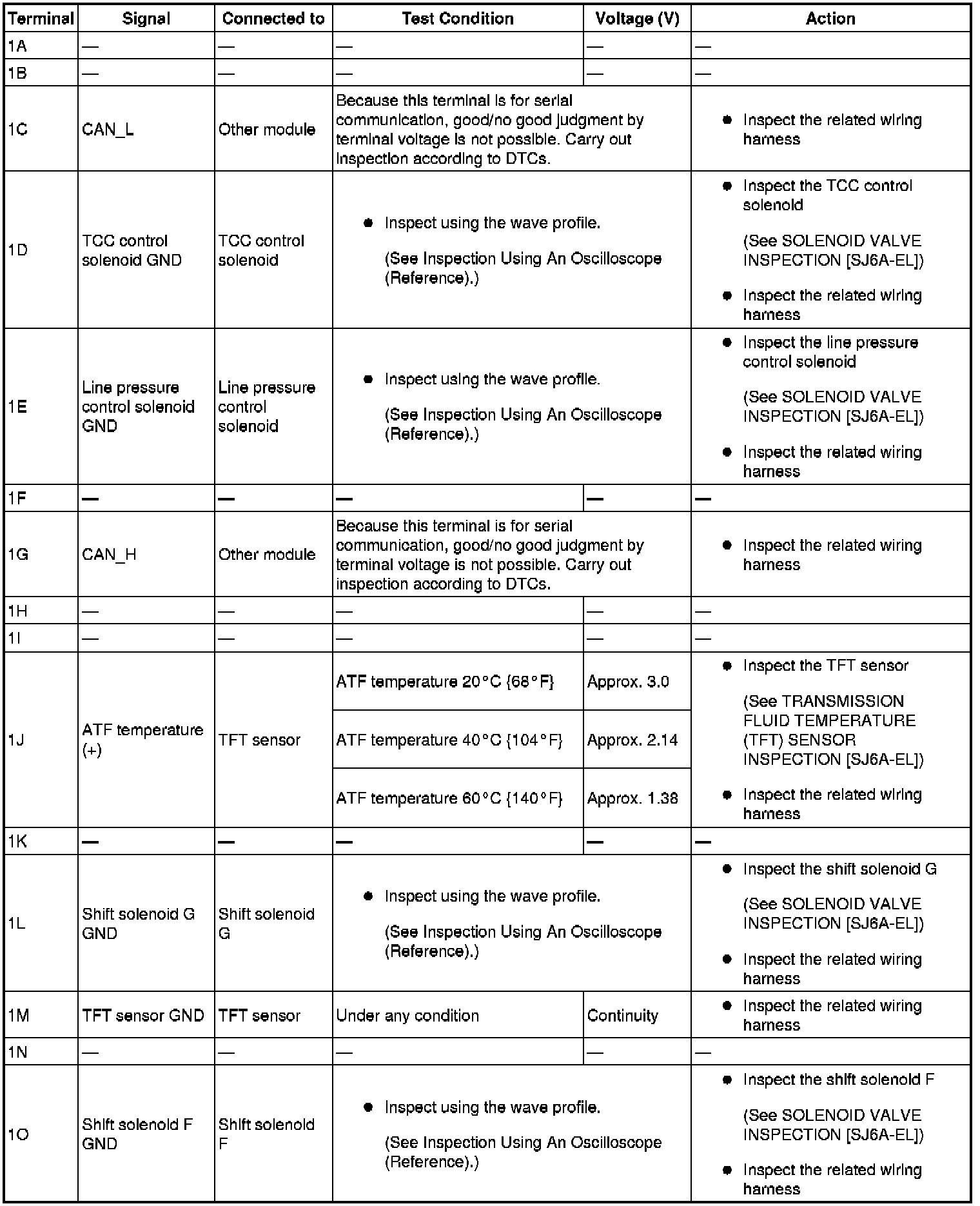 - Use the ground of terminal 1P and 1X of the TCM when measuring terminal voltage, as an error may occur when connecting the negative circuit tester to ground.