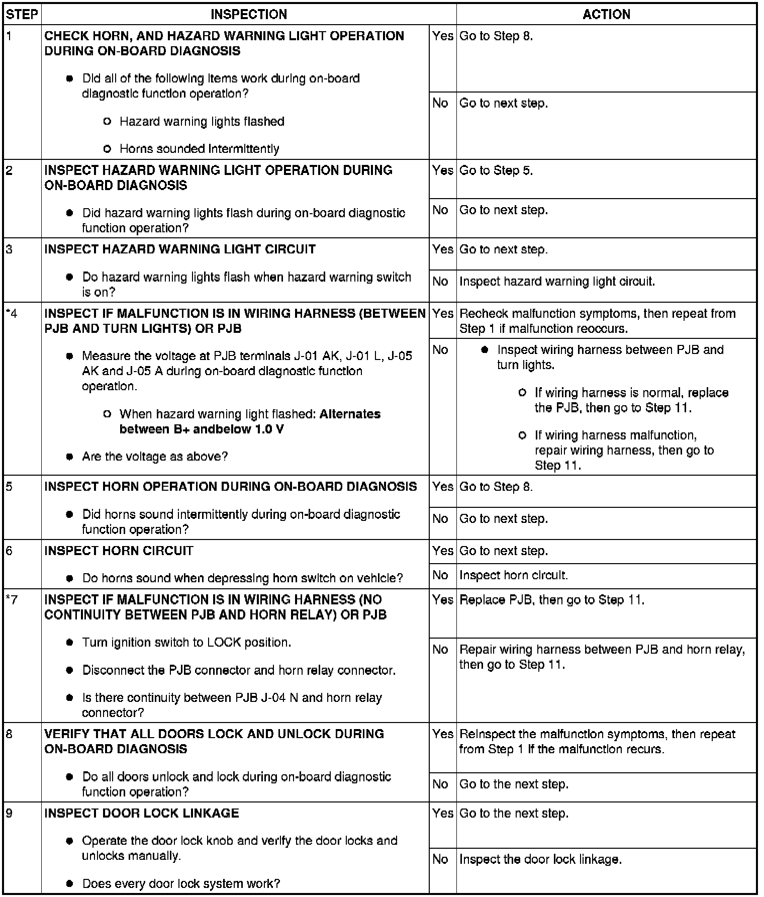 - When performing an asterisked (*) troubleshooting inspection, slightly shake the wiring harness and connectors while performing the inspection to discover whether poor contact points are the cause of any intermittent malfunctions. If there is a problem, verify that the connectors, terminals and wiring harnesses are connected correctly and undamaged.