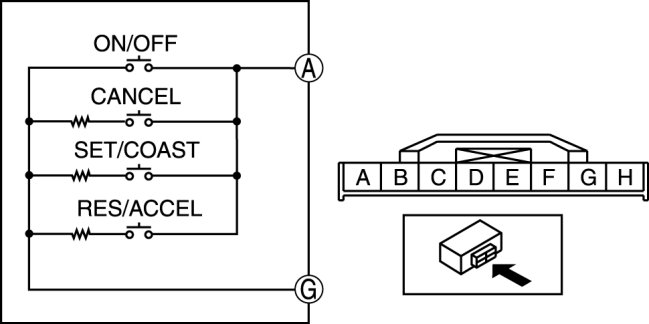 5. Inspect for resistance and continuity between cruise control switch terminals A-G using a tester.