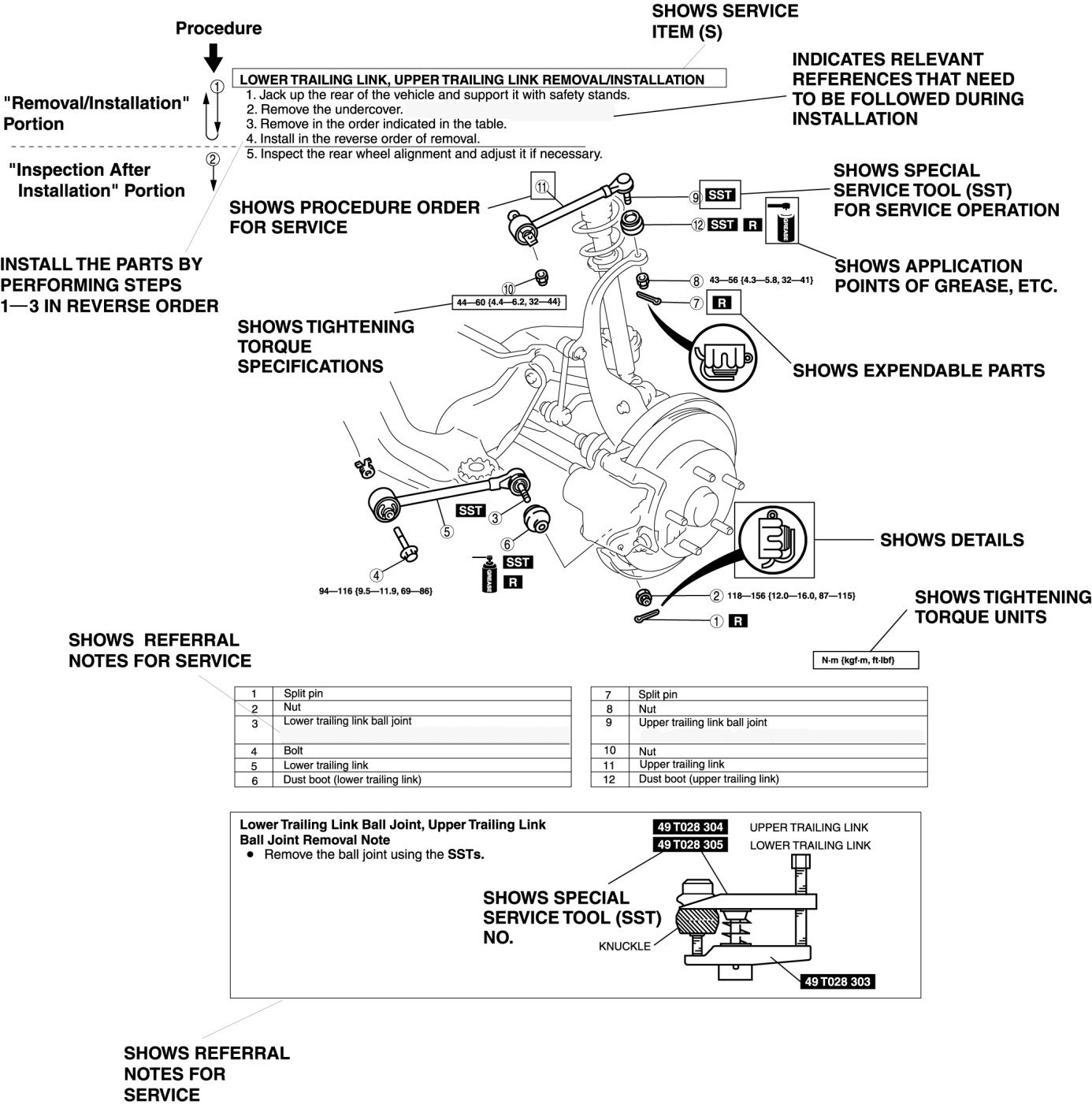 - Symptom troubleshooting shows diagnostic procedures, inspection methods, and proper action to take for each trouble symptom.