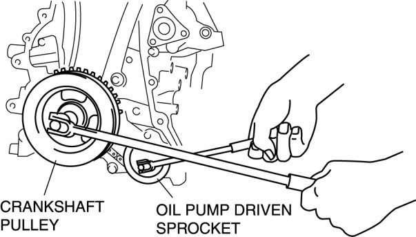 2. Install the oil pump driven sprocket, and then remove the crankshaft pulley and crankshaft pulley lock bolt.