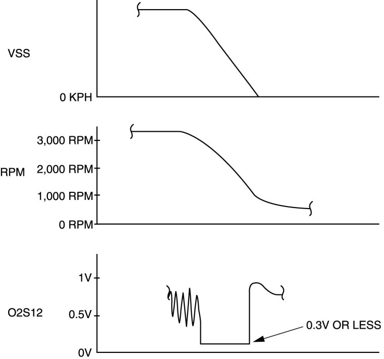 4. Verify that the HO2S outputs a voltage of 0.6 V or more, one time or more, then verify that the HO2S voltage (PID: O2S12) is 0.3 V or less while decelerating as shown in the figure.