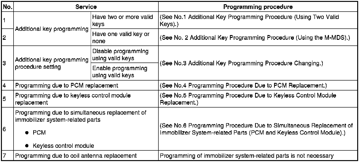 Immobilizer System-Related Parts Service and Programming Procedure Table