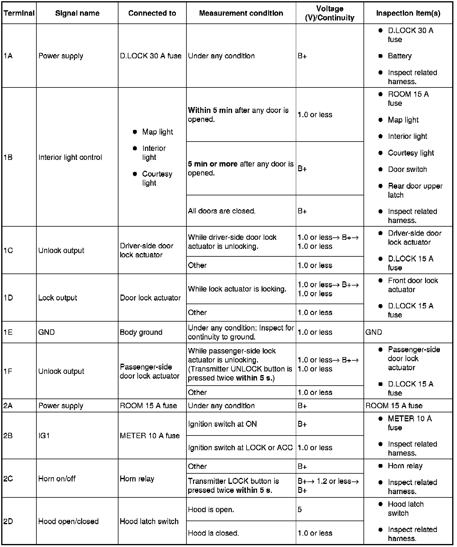 1. Measure the voltage or inspect for continuity according to the Terminal Voltage Table (Reference).
