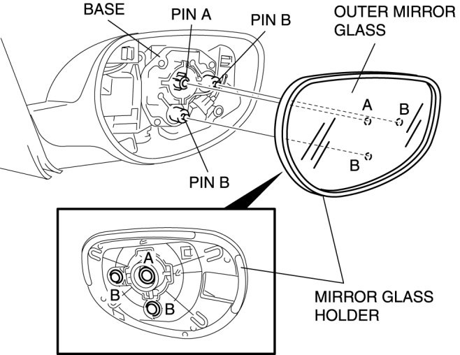 3. Pull out the mirror glass holder and detach pins B.