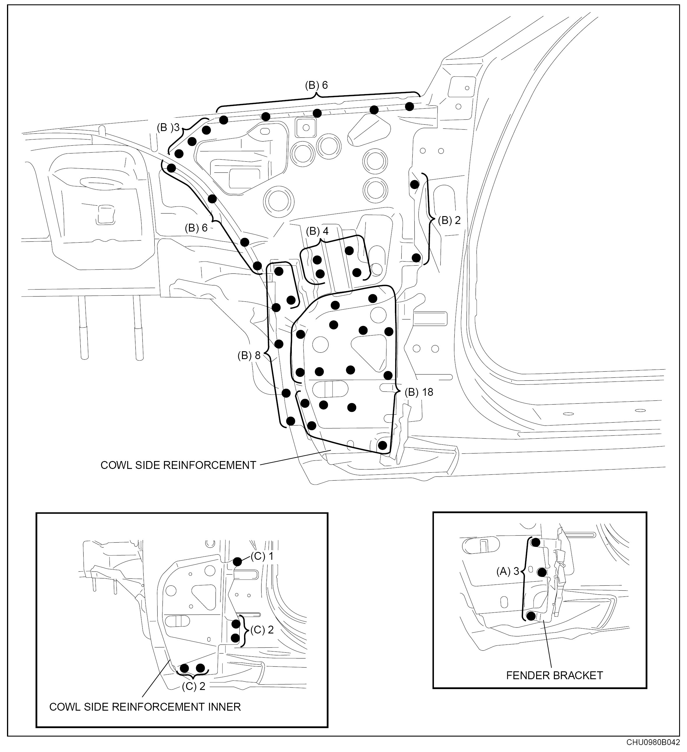 3. Drill the five weld locations indicated by (C) and remove the cowl side reinforcement inner.
