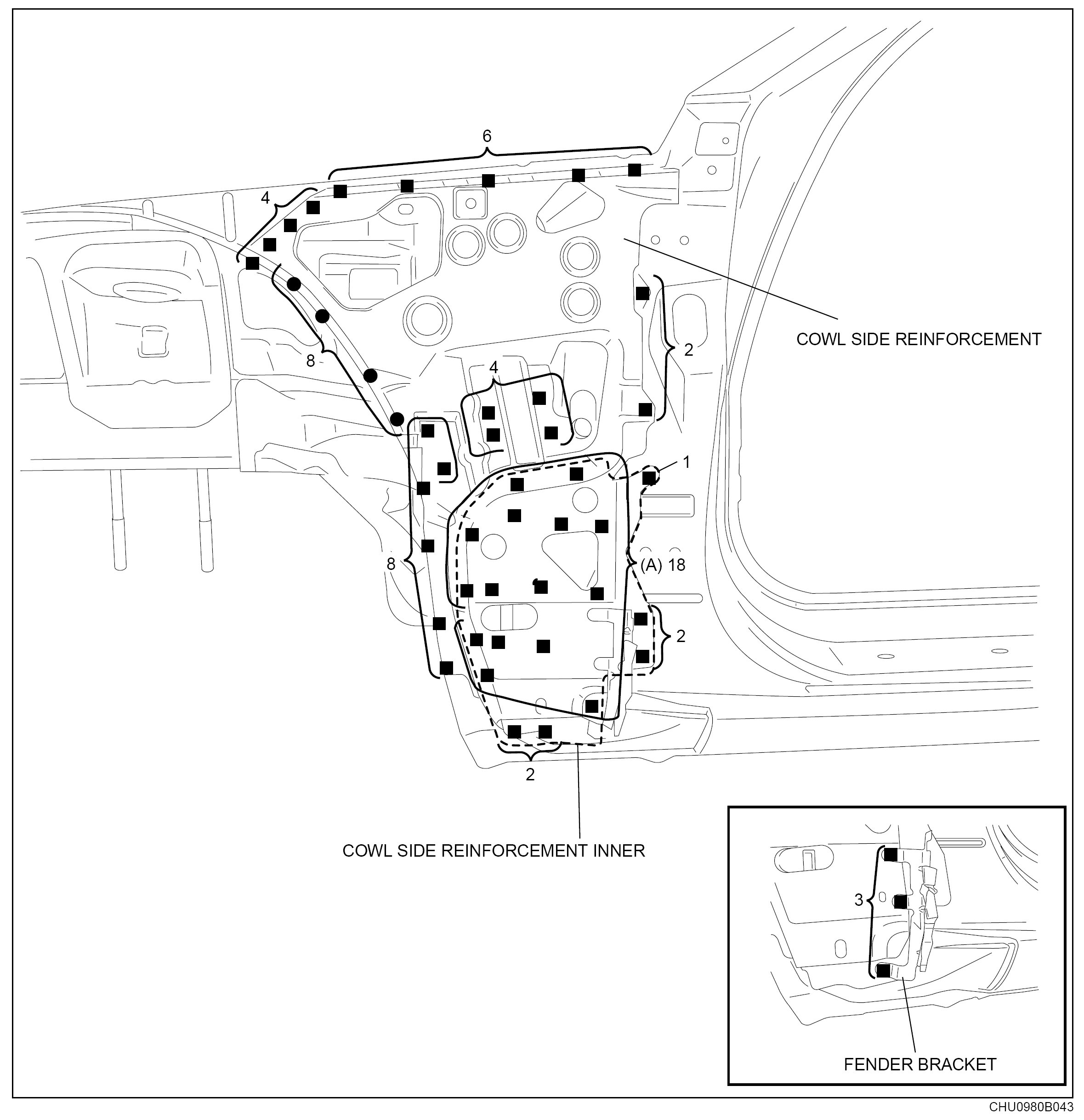 3. Weld the 18 locations indicated by (A), then temporarily installing the cowl side reinforcement inner and cowl side reinforcement.