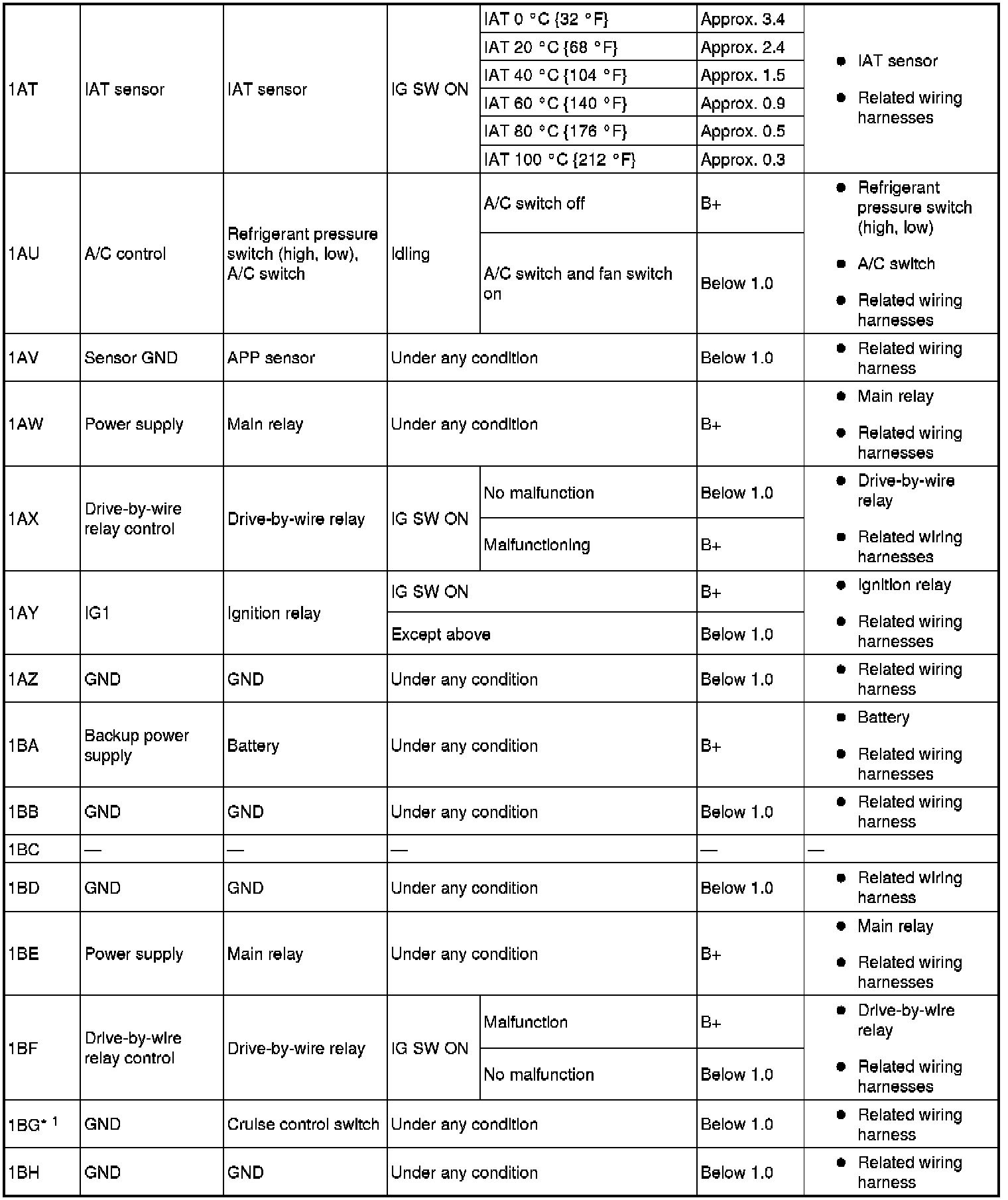 - If any incorrect voltage is detected, inspect the related system(s), wiring harnesses and connector(s) referring to the Action column in the terminal voltage table.