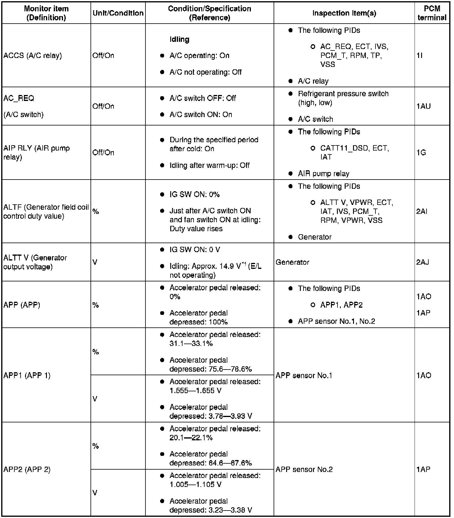 - The PCM terminal voltages vary with change in measuring conditions and vehicle conditions. Always carry out a total inspection of the input systems, output systems, and PCM to determine the cause of trouble. Otherwise, a wrong diagnosis will be made.
