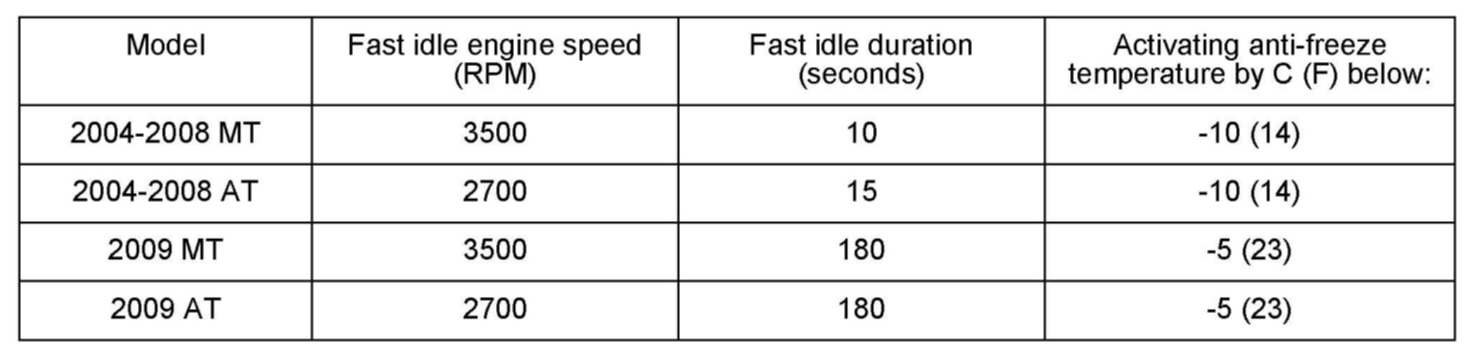 The original setting of fast idle duration at a cold engine start-up has been changed since start of production of the 2009 RX-8. This service bulletin is for aid in understanding the differences and advantages between previous and current fast idle duration.