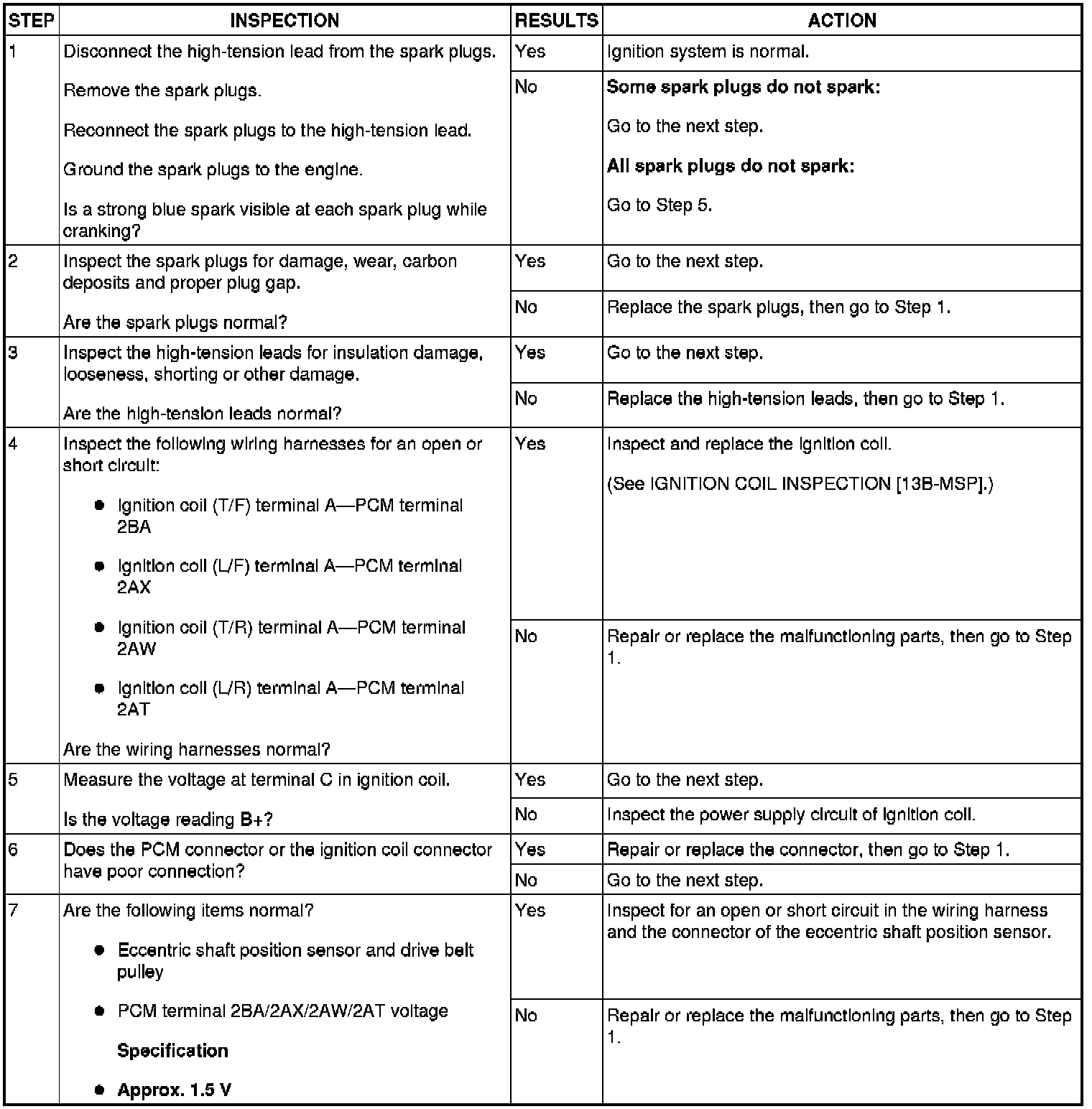 7. If not as specified, inspect the following and repair or replace defective parts.