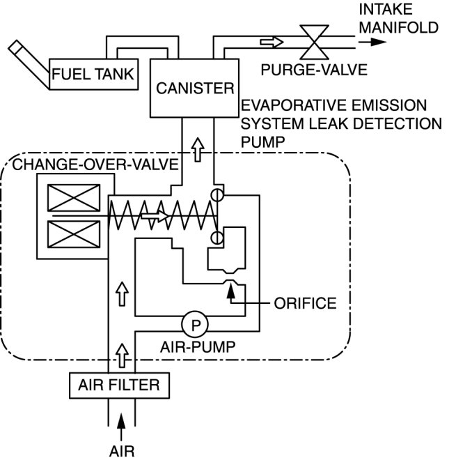 - The EVAP system test finds gas leaks in the system using the PCM to monitor changes in the air pump load current of the EVAP system leak detection pump. This test starts after sending an on-demand test signal from the M-MDS to the PCM. The PCM controls the air pump and change-over-valve operation and also stores the load current of the air pump as follows: