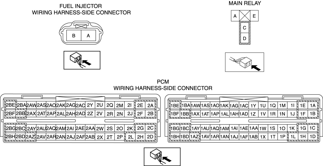 - Fuel injector (FP) terminal A and main relay terminal C
