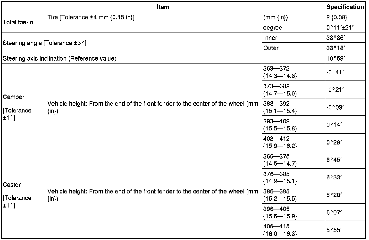 - Difference between the left and right dimension for camber and caster is within 1°.