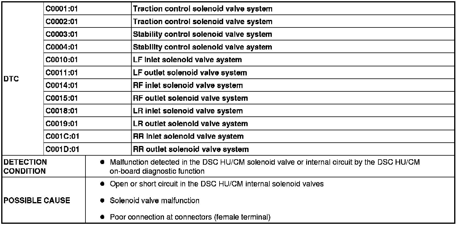 DTC C0001:01/C0002:01/C0003:01/C0004:01/C0010:01/C0011:01/C0014:01/C0015:01/C0018:01/C0019:01/C001C:01/C001D:01 [DYNAMIC STABILITY CONTROL (DSC)]