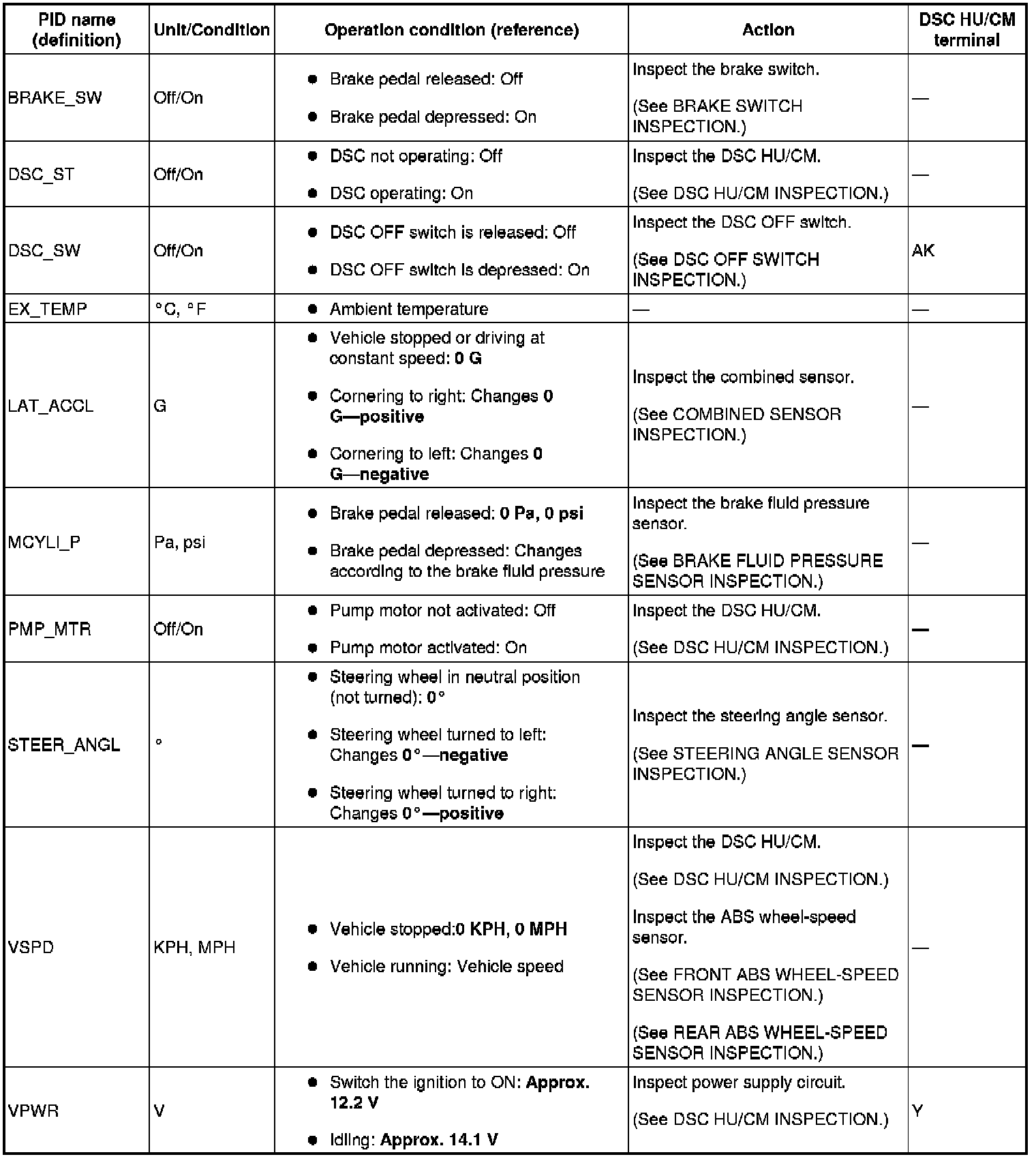 PID/Data Monitor Tables - Dynamic Stability Control (DSC)