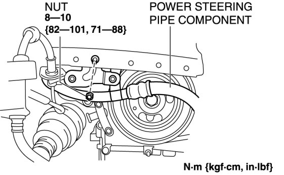 11. Remove the nut shown in the figure and set the power steering pipe component out of the way.