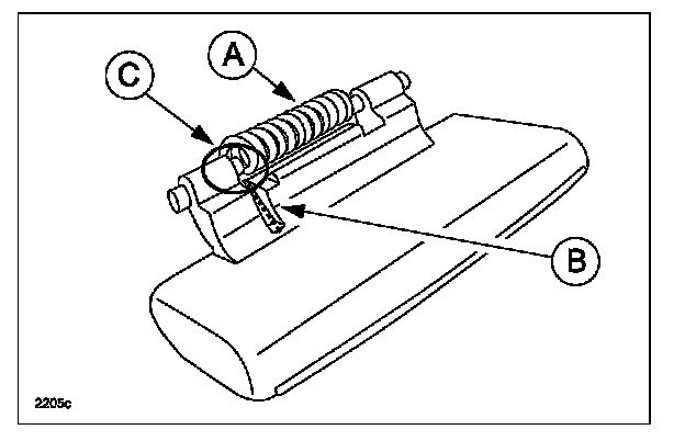a. Catch the edge (B) of the spring (shorter straight portion of the spring) with the boss (C) of the latch (groove side).