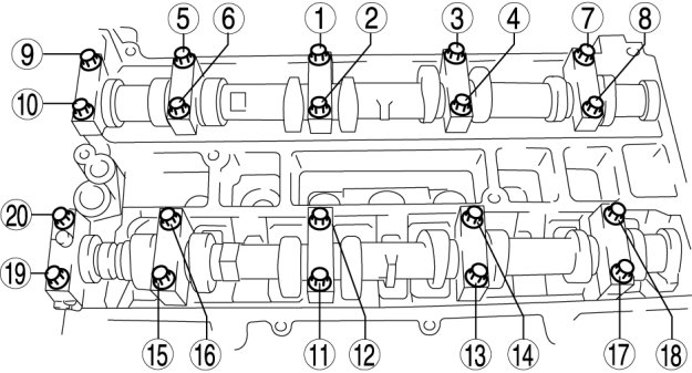 Temporarily tighten the camshaft cap bolts evenly in 2-3 steps.Tighten the camshaft cap bolts in the order shown in the following two steps.