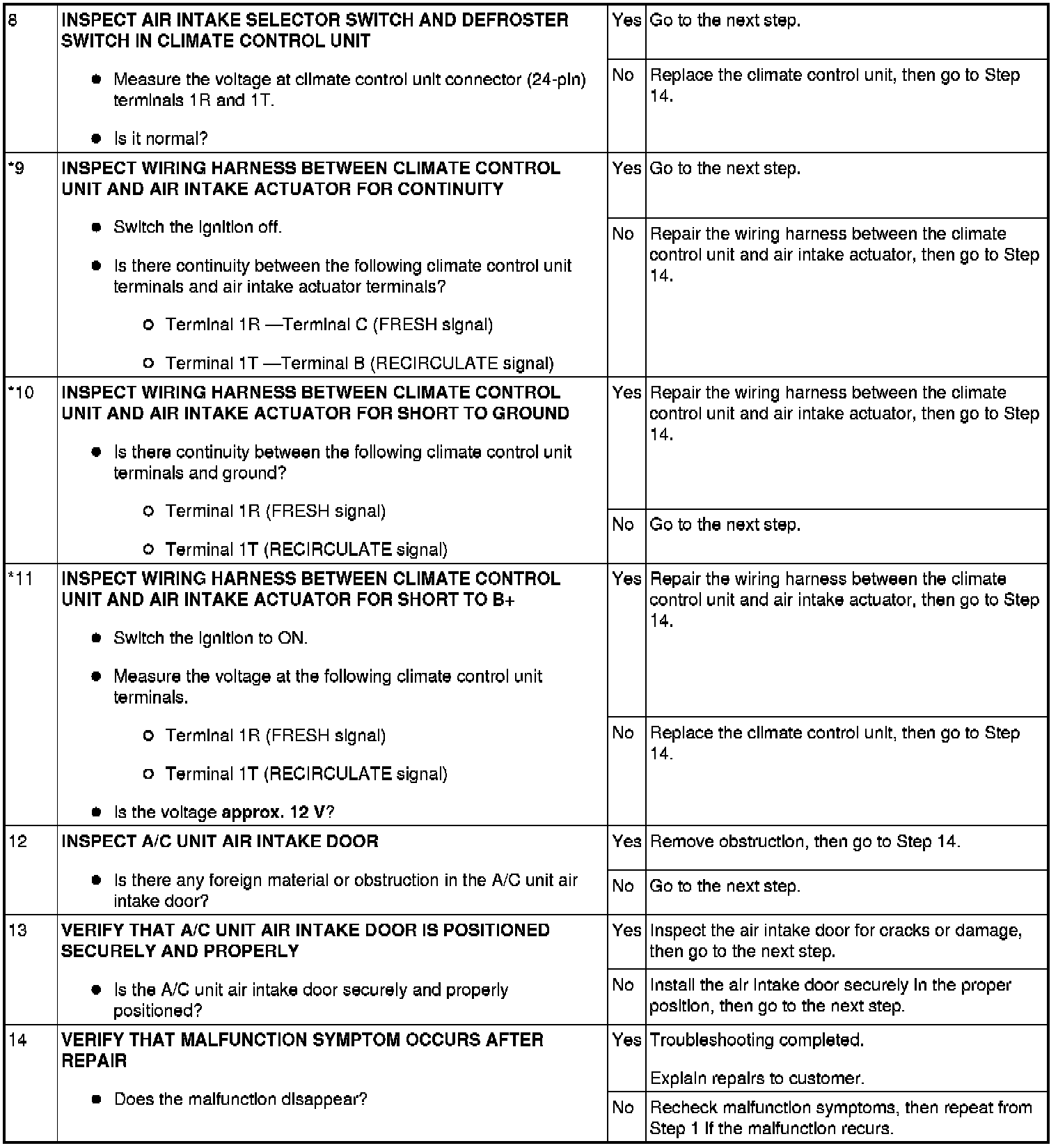- When performing an asterisked (*) troubleshooting inspection, shake the wiring harness and connectors while doing the inspection to discover whether poor contact points are the cause of any intermittent malfunctions. If there is a problem, inspect to make sure connectors, terminals and wiring harness are connected correctly and undamaged.