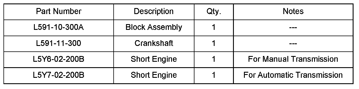 When only the crankshaft is replaced, replacement of the engine block and reprogramming of the PCM are not necessary as the pre-modified crankshaft (L505-11-300) is available as a service part.