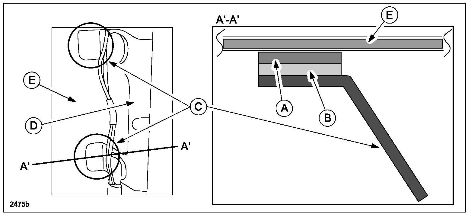 8. Apply the pads (A) over the existing pads (B) on the tabs (C) while pulling the bracket (D) downward from the roof panel (E).