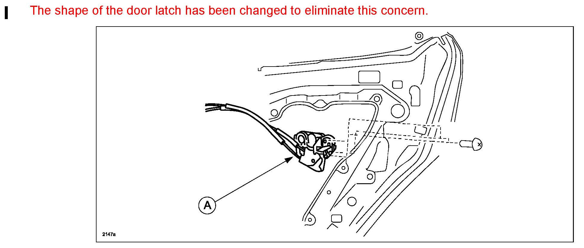 When ambient temperature rapidly drop below 0° F, especially after a rain or car wash, some vehicles may experience a rear door that is unable to open due to an inoperative rear door lock. This symptom tends to occur when the power door lock is operated. Water enters inside the rear door latch (A) and lock actuator, then becomes frozen and stuck.
