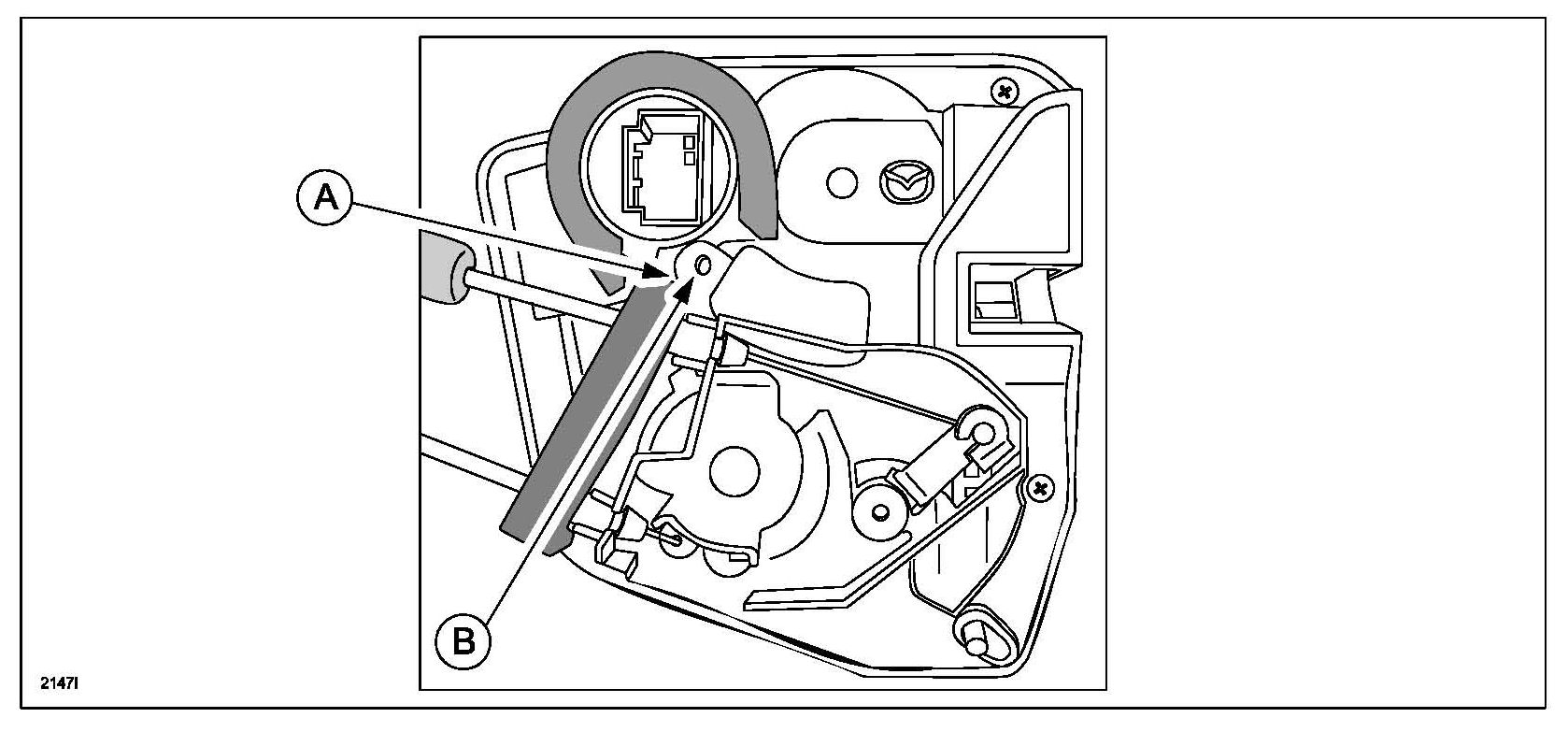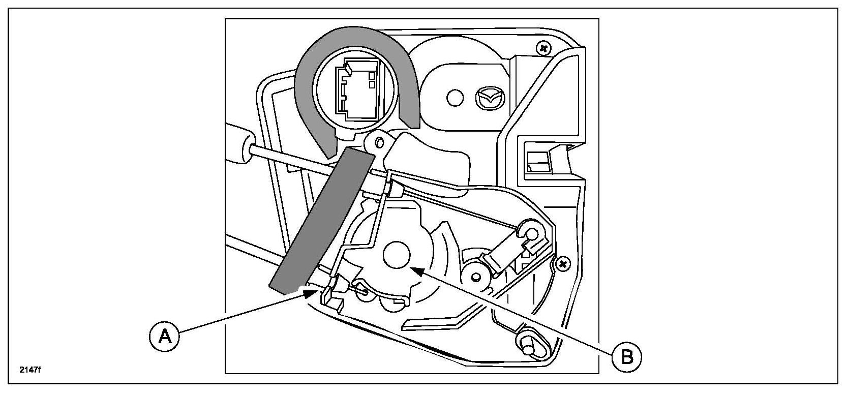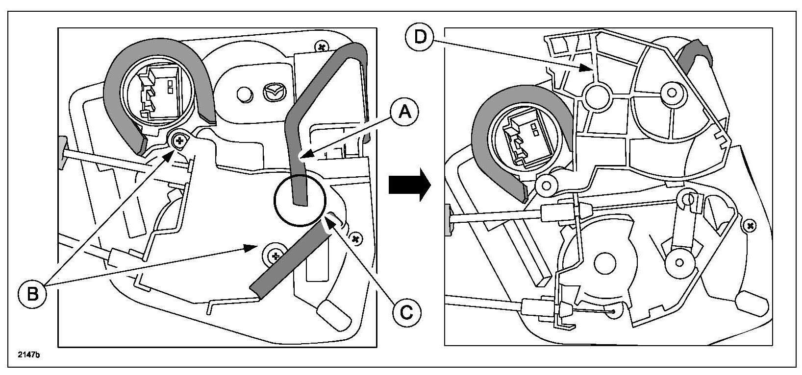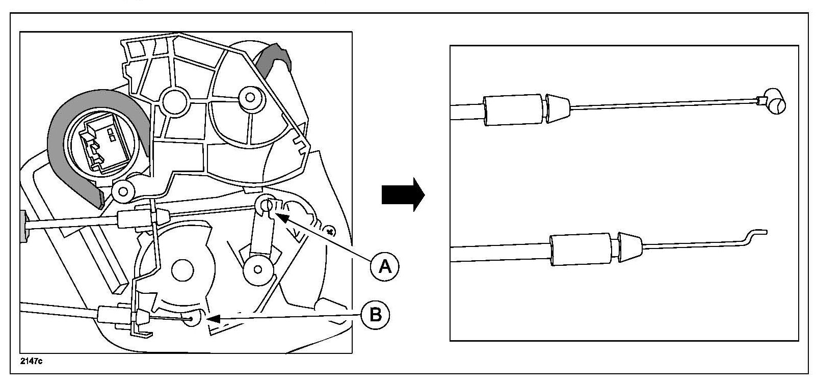 - On right door latch, make sure to install as the groove (B) on the end of inner cable can be seen.