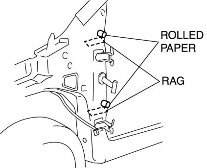 - Bolts or tools dropped into the A-pillar cannot be retrieved. To prevent this, after inserting clean rags into the A-pillar, roll up regular paper into a tube and insert it into each hole, and then secure each tube so that it does not move while performing the work.