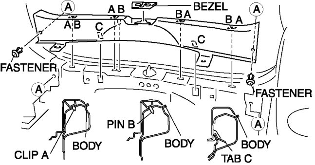 3. Pull the trunk end trim upward, then detach clips A, pins B, and tabs C.