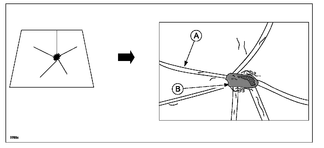 Cause: Crack (B) occurs when flying debris such as small stones or fallen objects on the road hit the windshield while driving the vehicle.