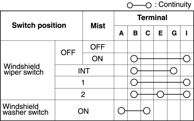 1. Verify that the continuity between the windshield wiper and washer switch is as indicated in the table.