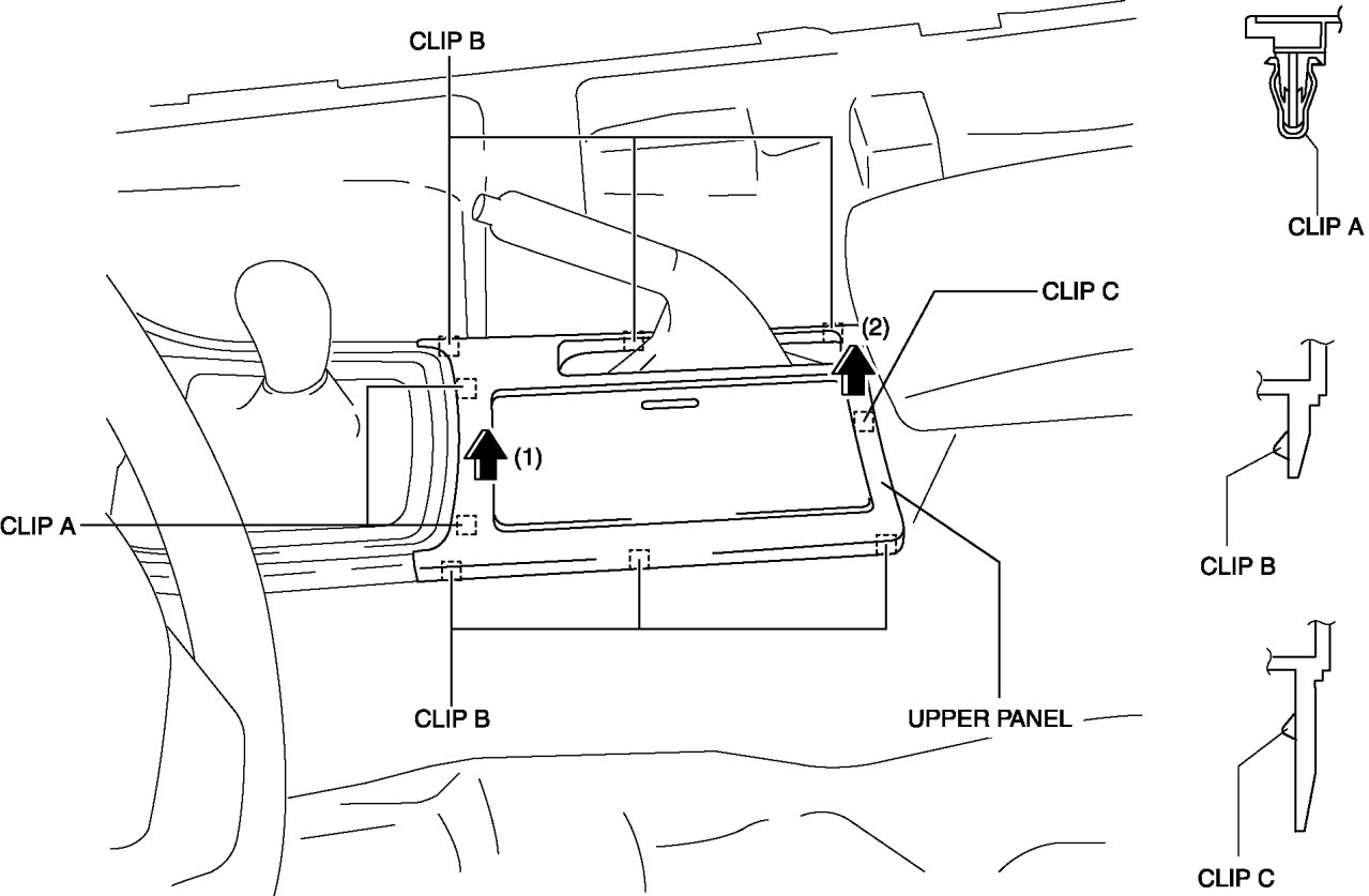 1. Pull the upper panel in the direction of the arrow in the order of (1) and (2), then remove it while detaching the clip A, B and C.