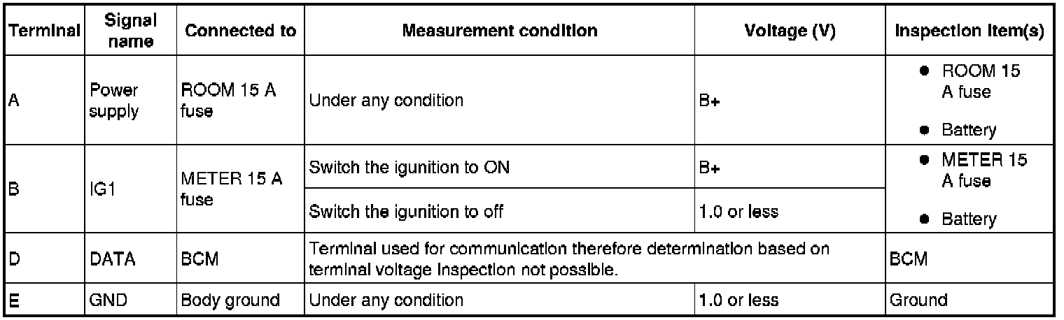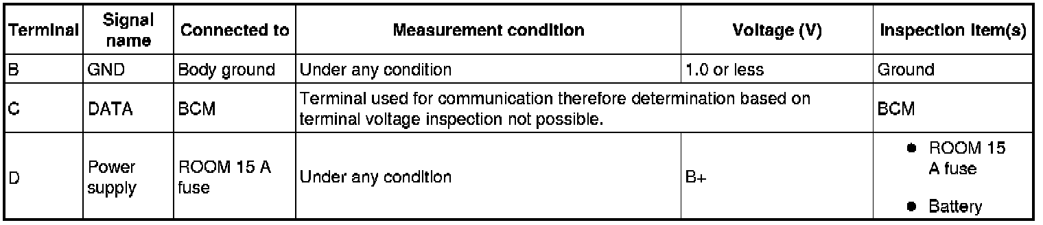 - If the voltages cannot be verified as indicated in the terminal voltage table, inspect the parts under "Inspection item(s)".