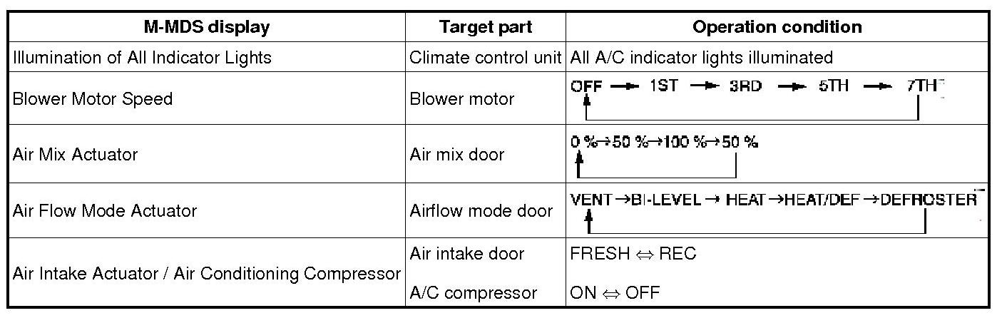 A/C Operation Check Mode Table