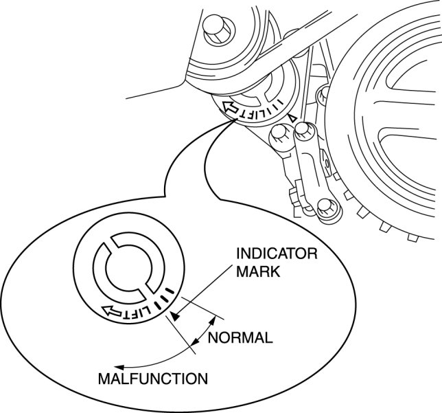 1. Verify that the drive belt auto tensioner indicator mark does not exceed the limit.